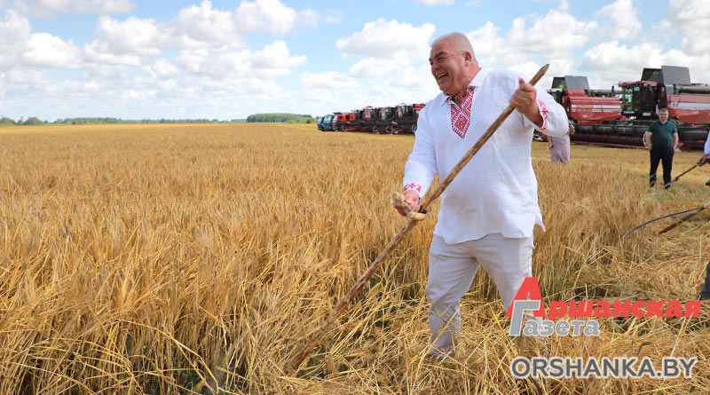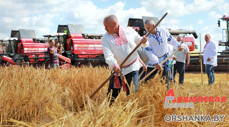 Перед тем как техника вышла в поле, Игорь Мороз вместе с гостями праздника дали старт жатве – скосили ручными косами первые колосья хлебной нивы.