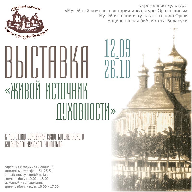 12 сентября в 16.00 в музее истории и культуры г. Орши состоится открытие выставки «Живой источник духовности». Выставочный проект приурочен к 400-летию со дня основания Свято-Богоявленского Кутеинского мужского монастыря.