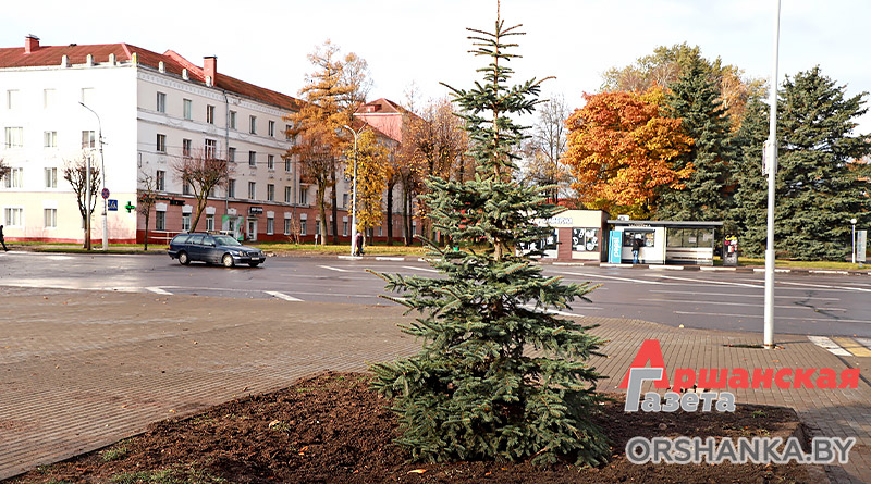 На площади льнокомбината высадили голубые ели