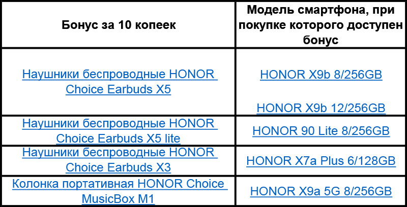 Перечень моделей смартфонов и бонусов к ним представлен в таблице: