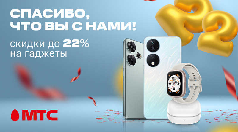 МТС исполнилось 22 года! В знак благодарности за доверие мы предлагаем своим абонентам персональную скидку на устройства и гаджеты до 22%. Приобрести их можно единым платежом, а также в рассрочку до 24 месяцев без первого взноса. Предложение действует в рамках акции «Спасибо, что вы с нами».