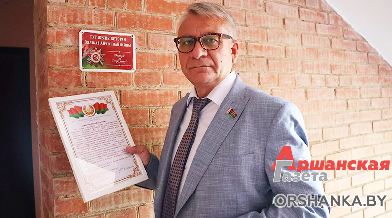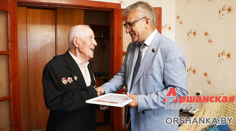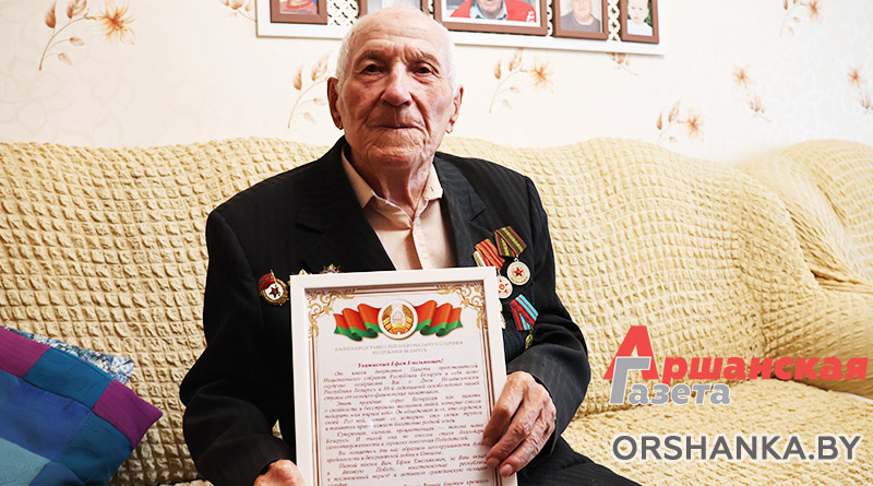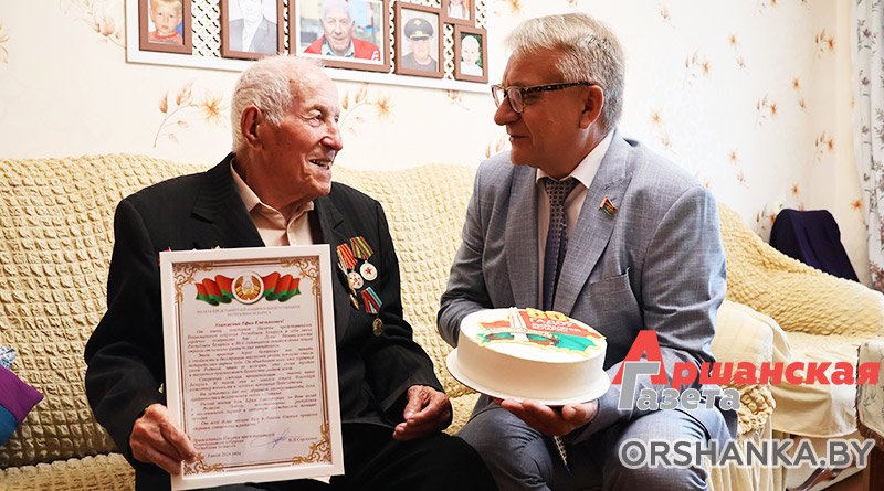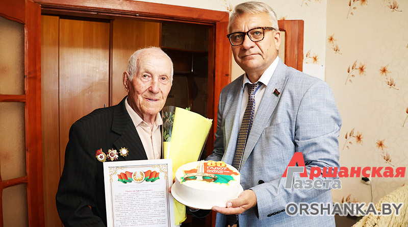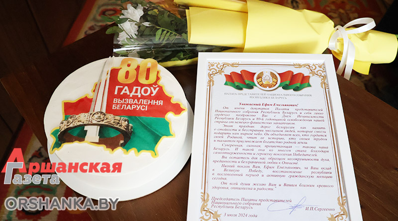 Несмотря на свой солидный возраст, 97 лет, Ефим Емельянович встречал гостей сам и при полном параде. Александр Михно тепло поздравил ветерана с праздником – Днем Независимости Республики Беларусь и вручил приветственный адрес от имени Председателя Палаты представителей Национального собрания Республики Беларусь Игоря Сергеенко. От всех депутатов он выразил слова благодарности за наше мирное небо над головой и пожелал Ефиму Емельяновичу крепкого здоровья, бодрости духа и оптимизма.