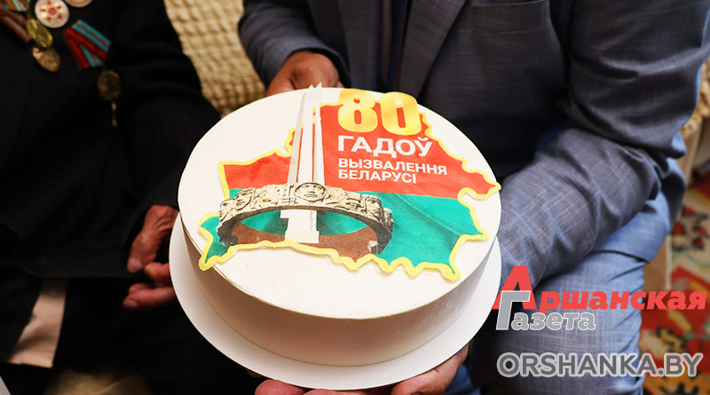 Еще одним сюрпризом для ветерана стал сладкий подарок – торт с логотипом праздника – 80-летие освобождения Беларуси от немецко-фашистских захватчиков.