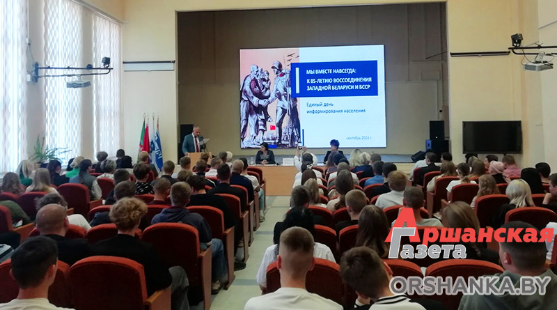 В Оршанском филиале Белорусского государственного университета железнодорожного транспорта прошла встреча с учащимися в рамках Единого дня информирования, посвященного Дню народного единства. Слоган мероприятия — «Мы вместе навсегда: к 85-летию воссоединения Западной Беларуси и БССР».