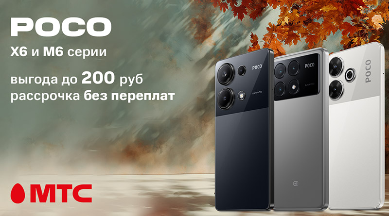 Осеннее предложение в МТС: скидки и рассрочка без переплат на POCO Х6 и M6 серии. Высокопроизводительные смартфоны с емкой батареей и мощной турбозарядкой можно приобрести в рассрочку без переплат от 26,05 рубля в месяц.