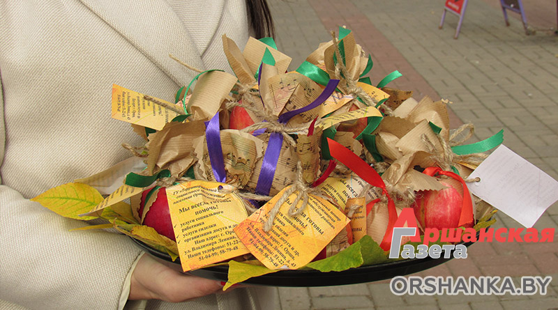 Для пожилых людей были сделаны многочисленные подарки. В их числе красочные открытки и декорированные яблоки с информацией об услугах, которые территориальный центр оказывает пожилым людям и инвалидам. Эти подарки социальные работники раздавали на улицах города, чтобы как можно больше оршанцев знали, куда можно обратиться в трудную минуту.