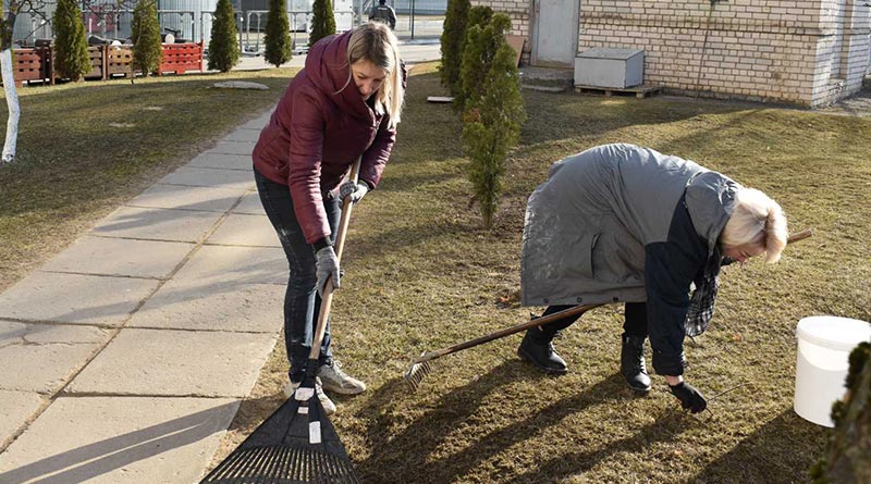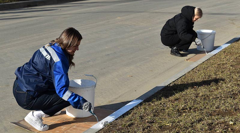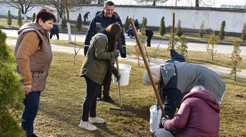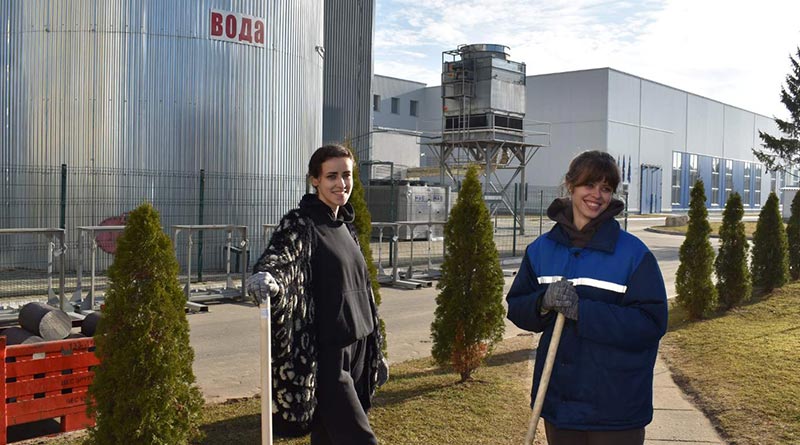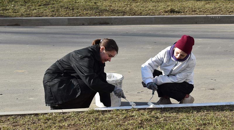 Метут дорожки, выгребают прошлогоднюю листву с газонов, белят стволы деревьев и бордюры работники филиала «БЕЛАЗ» — управляющая компания холдинга «БЕЛАЗ-ХОЛДИНГ» — «Индустрия колец».