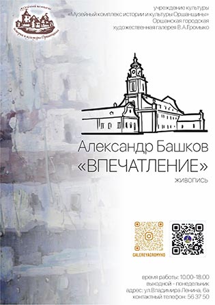 17 апреля в 16.00 в Оршанской городской художественной галерее В. А. Громыко состоится торжественное открытие персональной выставки живописи Александра Башкова «Впечатление».