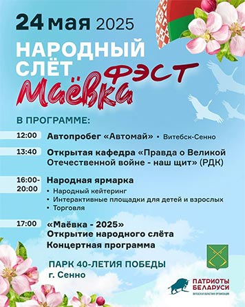 – Народный слет «Маевка Фест» – это совместный проект Витебской областной организации «Патриоты Беларуси» и Сенненского райисполкома. Мероприятие пройдет впервые. Символично, что «Маевка Фест» состоится в Сенно, на родине автора национального орнамента Маркевич Матрены. Уверен, что фест станет традиционным, – отметил председатель Витебской областной организации РОО «Патриоты Беларуси», депутат Палаты представителей Национального собрания Республики Беларусь Владимир Бабичев.