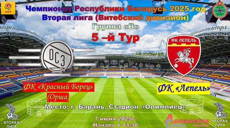 Как рассказали журналисту «Аршанскай газеты» в отделе спорта и туризма Оршанского райисполкома, 7 июня во второй лиге чемпионата Беларуси по футболу 2025 года сыграют команды группы «В» Витебского дивизиона ФК «Красный борец» и ФК «Лепель».
