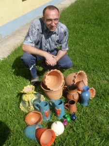 На працоўным стале майстра – сувенірныя гарлачыкі, гліняны посуд. Але больш за ўсё яму ўдаюцца скульптуры паркавай архітэктуры – вясёлыя і забаўляльныя твары сапраўдных казачных герояў, магчыма, выдуманых самім керамістам. Гатова да абпалу і серыя новых гліняных сувеніраў з вобразамі вясёлых простых людзей і хатніх жывёл, з ёмістасцямі для захоўвання алоўкаў. Вырабляе ён іх без усялякіх эскізаў. Бярэ кавалак гліны і, як толькі пальцы кранаюць матэрыял, пачынаецца сапраўднае дзейства. Пакуль зробіць гатовую скульптуру, бывае, нават, усё жыццё разам з гэтым вобразам перажыве, будзь гэта вясковы мужычок, які грае на дудцы, ці раскормлены дбайнай гаспадыняй кот, згадываючы пра поўны сподак смятаны.