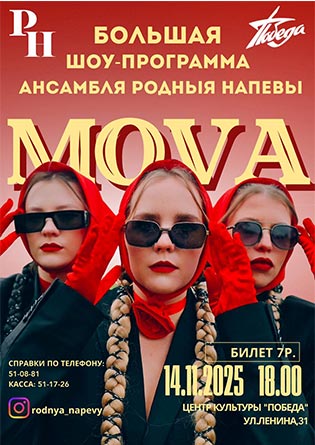 14 ноября в 18.00 в Оршанском районном Центре культуры «Победа» состоится презентация нового музыкально-танцевального проекта «MOVA» от известного ансамбля «Родныя напевы». Мероприятие позиционируется как яркое шоу, выходящее за рамки традиционного концерта.