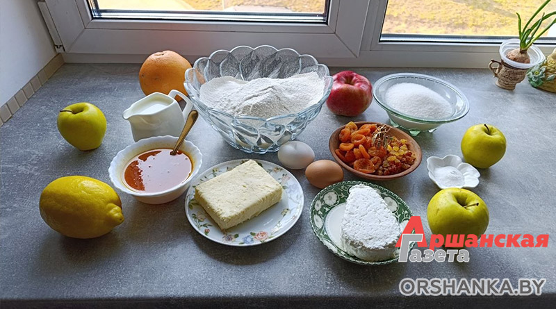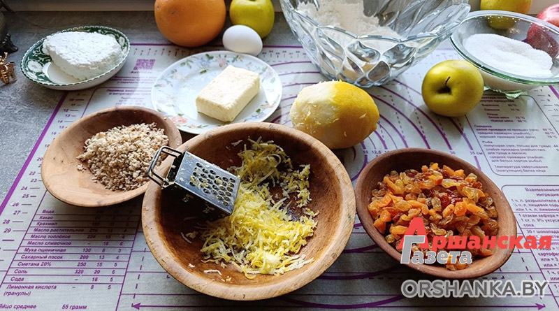 Нам понадобится: мука (просеянная) – 350 г, разрыхлитель – 1 ч. л. с горкой, лимон, творог – 250 г, сливочное масло – 100 г, 1 яйцо, 100 г сахара, 130 г кураги, 60 г изюма, 100 г орехов, сахарная пудра – 60 г.