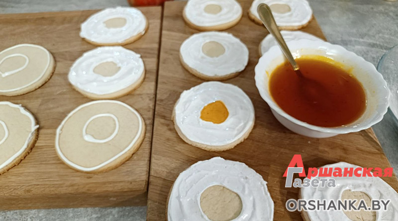 Взбиваем белок до образования белой массы. Постепенно вводим сахарную пудру и сок лимона, постоянно взбивая. Белковый крем перекладываем в кондитерский мешок и на охлажденном печенье делаем рисунок в виде яичного белка, оставляя в центре место для желтка из джема. Когда глазурь почти высохнет, в центр каждого печенья выкладываем джем.