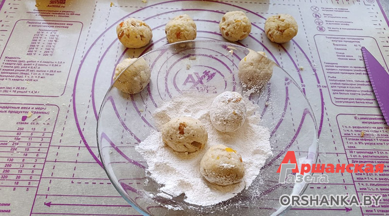 Делим тесто на 20 шариков. Обваливаем шарики в пудре. Выкладываем на противень и слегка прижимаем. Ставим в духовой шкаф ориентировочно на 20-25 минут (ориентируйтесь на свой духовой шкаф). Остужаем и наслаждаемся!