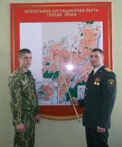 На снимке: командир третьего патрульного взвода Артём Масалович знакомит ефрейтора Дмитрия Тараканова с маршрутами патрулирования г. Орши.