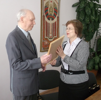 Заместитель главврача по медицинскому обслуживанию населения УЗ “ОЦП” Л. Петрова вручает Почетную грамоту юбиляру