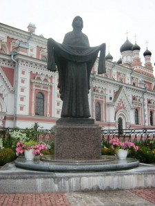 Около собора мы осмотрели бронзовую скульптуру «Покров Пресвятой Богородицы», установленную к 14 октября 2010 года. Затем мы направились в одну из самых почитаемых святынь Гродно – действующую Коложскую (Борисоглебскую) церковь, построенную в XII веке. Здесь в 1410 году молились люди, уходя на Грюнвальдскую битву – решающее сражение против Тевтонского ордена. Мы приложились к чудотворному образу Матери Божией Коложской, которая находится с левой стороны у царских врат (празднование 22 июля). Аналогов этой интереснейшей иконы очень мало. Сама святыня XVIII века утеряна во время Первой мировой войны. В храме находится её копия, выполненная современным иконописцем Ю. Жаровым.