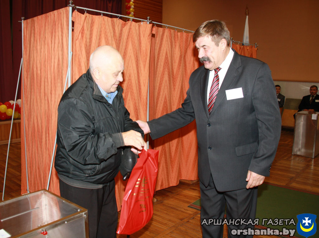 После того, как Иван Алексеевич Ковалев опустил в урну для голосования бюллетень, председатель участковой комиссии участка для голосования №17 Александр Шульгин поздравил первого избирателя и вручил ему сувенир.