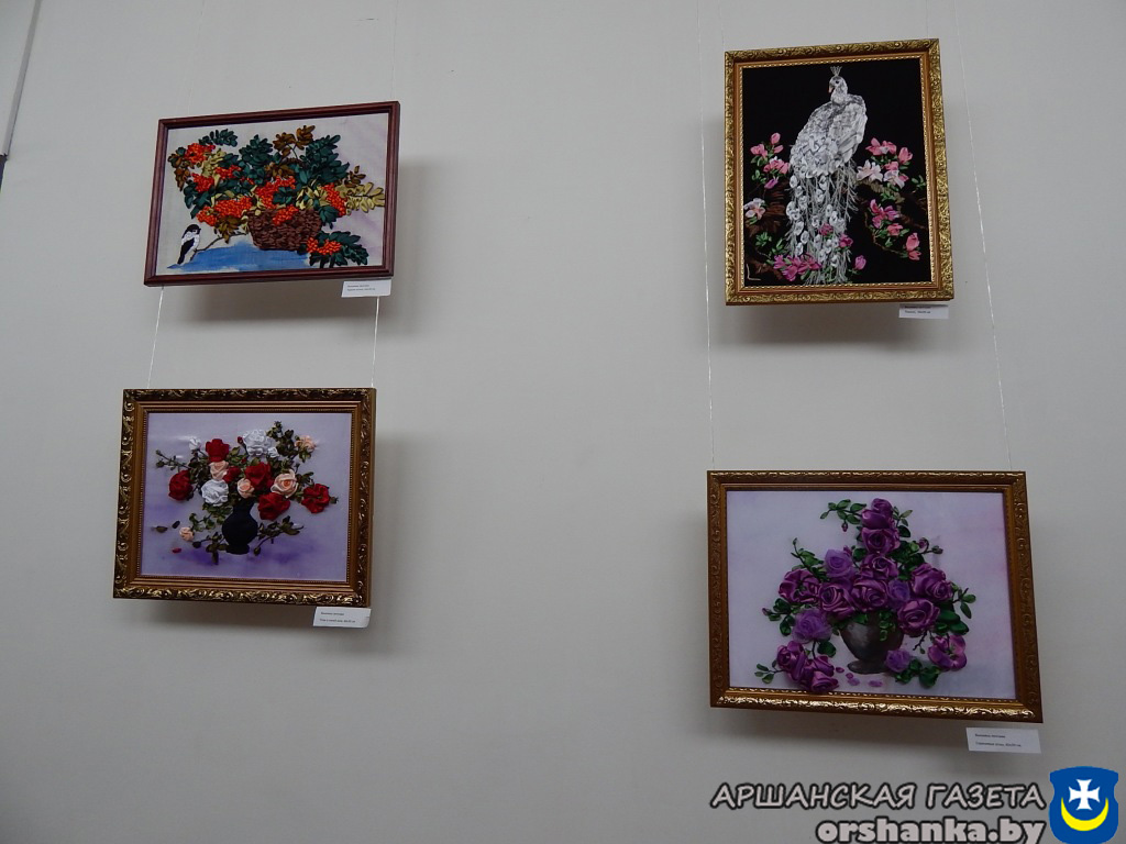 В выставочном зале музея представлено около 90 работ. Это картины, панно, миниатюры, скатерти, покрывала, наволочки, саше, сумочки, клатчи – и все в цветочном великолепии атласных ленточек. Отдельное место занимают работы с изображением птиц: павлинов, попугаев, колибри.