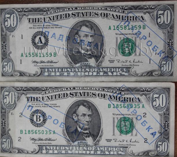В Витебске задержана группа фальшивомонетчиков, которые на территории области сбывали 50-долларовые купюры. Фальшивые купюры были изготовлены из подлинных путем изменения их номинала с 5 на 50 долларов.