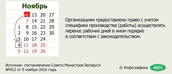 Рабочий день с понедельника 6 ноября переносится на субботу 4 ноября. Организациям предоставлено право с учетом специфики производства осуществлять перенос рабочих дней в ином порядке в соответствии с законодательством.