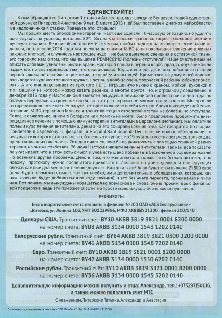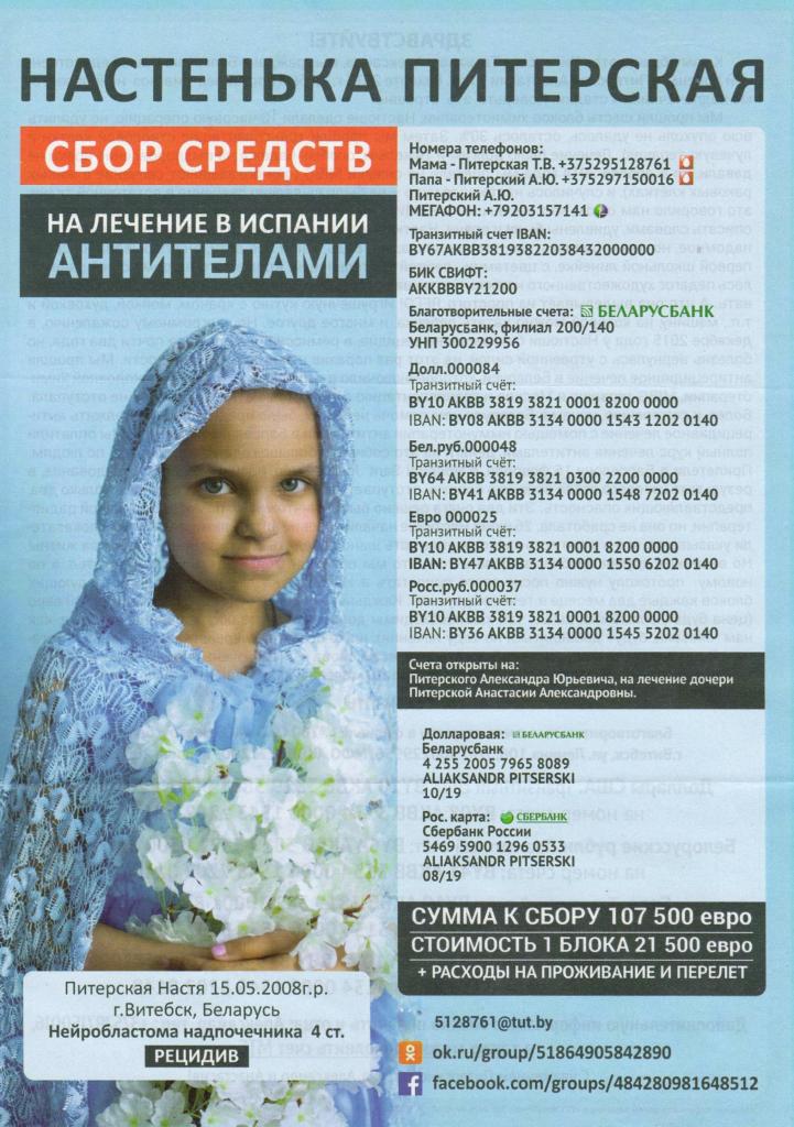 Насте Питерской из Витебска собирают деньги на лечение от рака. Один блок терапии антителами в Испании стоит 21,5 тысячи евро. Проводить лечение нужно каждые два месяца.