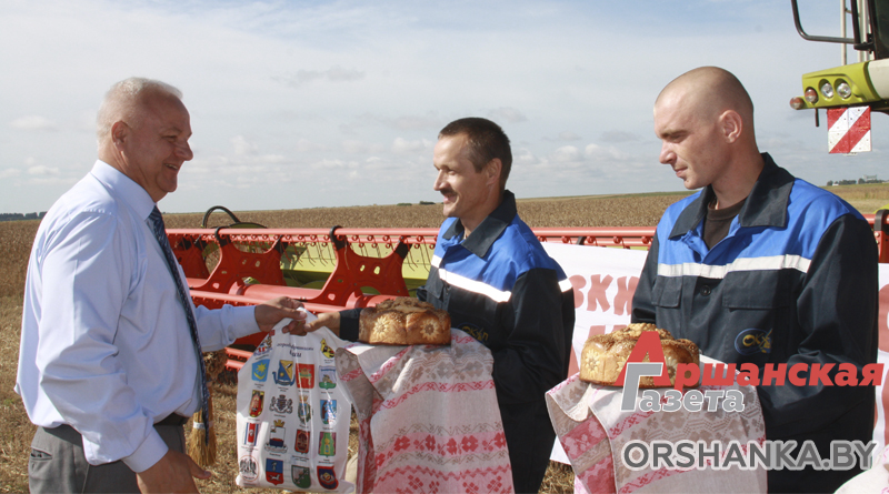 У гэты ж дзень на палях СУП “Барздоўка-агра” Аршанскага КХП з тысячным намалотам старшыня абласной арганізацыі Беларускага прафсаюза работнікаў АПК Віктар Гутараў і раённага прафсаюза АПК Станіслаў Кошкін, кіраўніцтва КХП і гаспадаркі павіншавалі камбайнера Уладзіміра Палячынскага.
