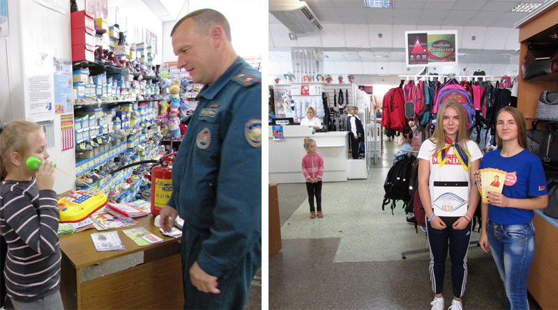 «Уважаемые покупатели! Сегодня в Доме торговли Министерство по чрезвычайным ситуациям проводит республиканскую акцию «В центре внимания – дети!». Собирая ребенка в школу, напомните ему основные правила безопасности, выучите с ним телефоны экстренных служб, объясните, что играть со спичками и огнем опасно для жизни. Именно от вас зависит безопасность ваших детей. Берегите их!» — такие призывы доносились из динамиков в оршанском Доме торговли.