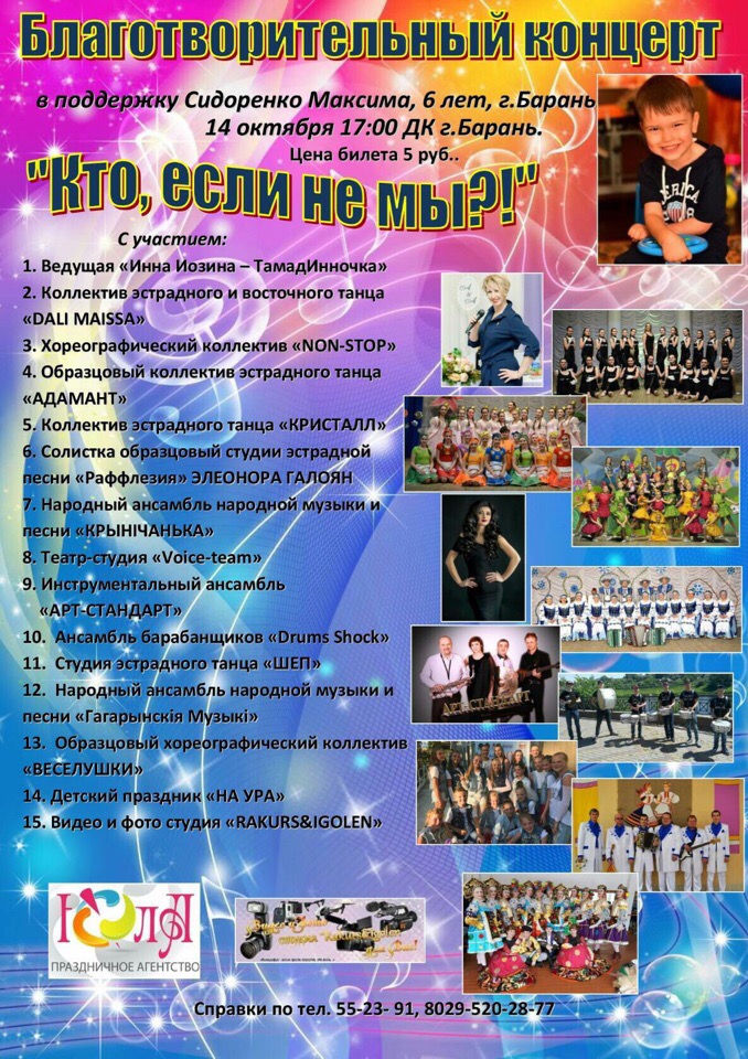 Благотворительный концерт-акция «Кто, если не мы?» пройдет 14 октября во Дворце культуры г. Барани. Марафон добра направлен на сбор средств для реабилитации и лечения пятилетнего Максима Сидоренко.
