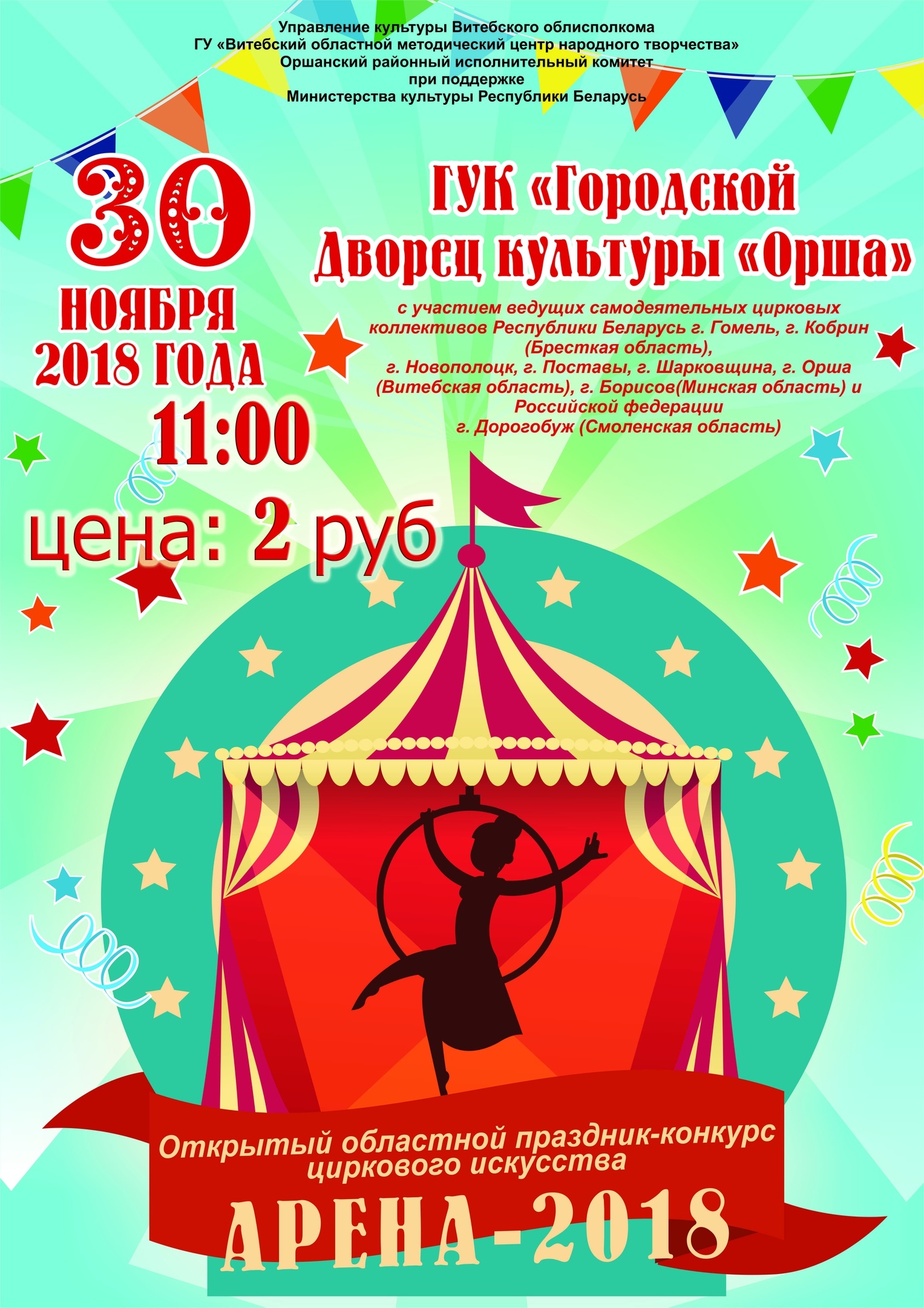 На открытом областном празднике-конкурсе циркового искусства «Арена-2018» в городском Дворце культуры «Орша» выступят 14 любительских цирковых коллективов из Беларуси и три – из России. Жители нашего района смогут поддержать юных талантливых земляков – воспитанников цирковых студий «Арена» (ГДК «Орша»), «Феерия» (ДКЖ) и «Фантазеры» (ГЦК «Победа»).