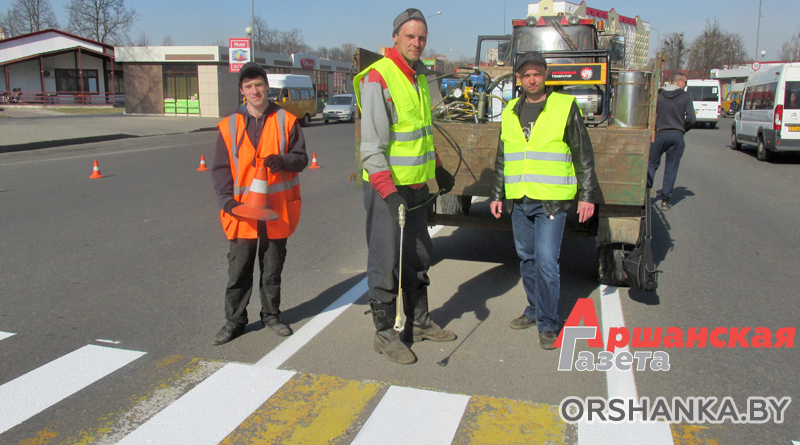 Мастер дорожного участка Виталий Ермаков, а также Александр Станкевич, Николай Чернявский и другие дорожные рабочие в эти дни обновляют краски на пешеходных переходах. Николай Гореньков, Игорь Соломаненко, Валерий Котеловский очищают от прошлогодней краски ограждение вдоль берега Оршицы. Павел Подчапаев, Александр Шакуто, Николай Сплошной, Владимир Антоненко и другие дорожные рабочие чистят ограждения и обрабатывают их антикоррозийным раствором на