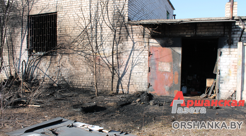 Отправляемся в микрорайон, а по пути видим дым в парке льнокомбината. Спасатель сообщает коллегам о происшествии, а диспетчер рассказывает, что в этот момент бойцы тушат гараж, огонь на который перекинулся с горящей травы. Берем курс на ул. 1 Мая. К нашему приезду спасатели уже справились с огнем и сворачивают оборудование. Пламя повредило ворота гаража, закопчены стены.