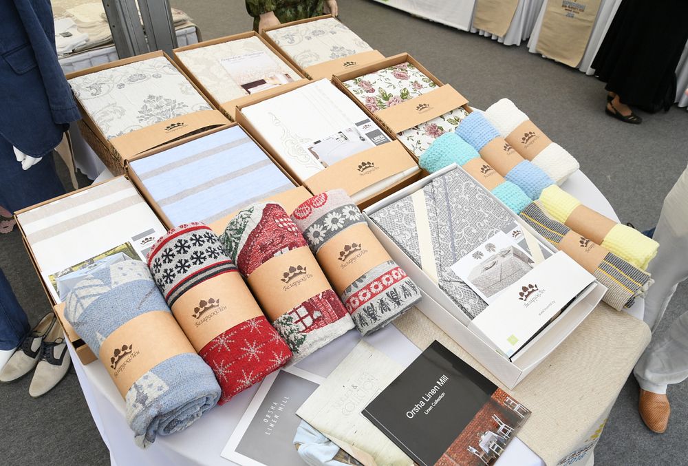На выставке участники мероприятия ознакомились с продукцией, которую изготавливают из белорусского льна. Коллегам из России представили продукцию из короткого волокна: домашний текстиль, который отшивают на льнокомбинате, одежду разных фабрик, обувь «Белвест» и сумки «Галантея». Начальник управления развития ассортимента и рекламы продукции Игорь Ещенко рассказал, что на Дне льняного поля представили армейский костюм – образец пошили для Государственного пограничного комитета Республики Беларусь.