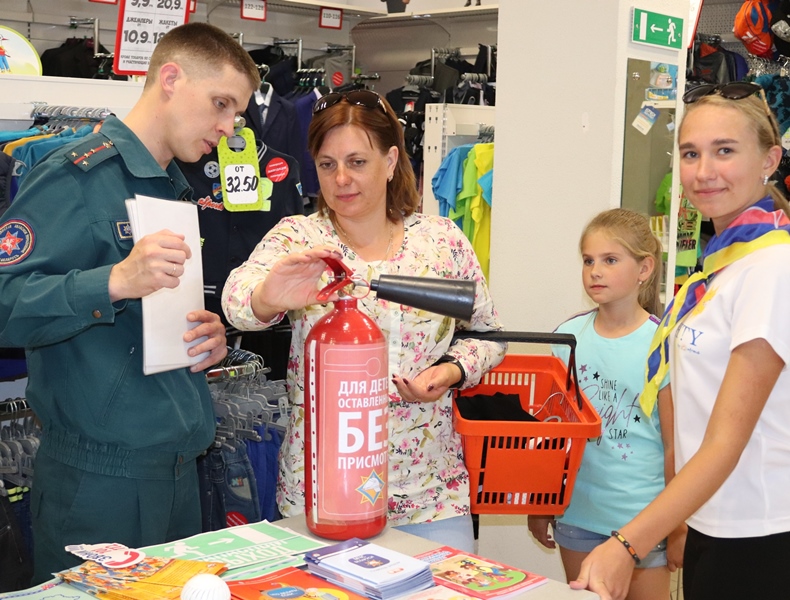 Работники МЧС совместно с активистами Белорусской молодежной общественной организации спасателей-пожарных в рамках республиканской профилактической акции “В центре внимания – дети!” организовали обучающую площадку в супермаркете “Буслік”.