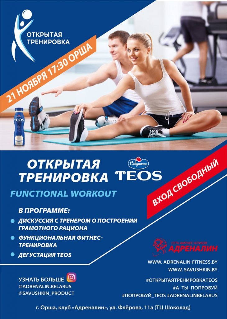 Бесплатная тренировка для жителей Орши пройдет 21 ноября в 17:30 в фитнес-клубе «Адреналин» (ул. Флерова, 11а, ТЦ «Шоколад»). Занятие станет частью социального проекта «Открытая тренировка TEOS», который почти год реализуется компанией «Савушкин продукт». Цель проекта – популяризация здорового образ жизни и правильного питания.