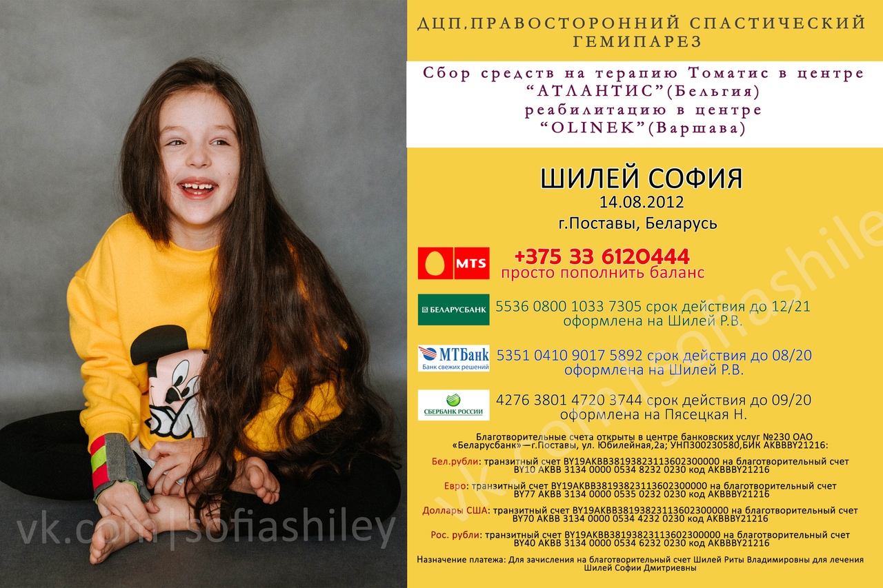 Назначение платежа: Для зачисления на благотворительный счет Шилей Риты Владимировны для лечения Шилей Софии Дмитриевны - Благотворительный номер МТС: +375336120444 (просто пополнить баланс)