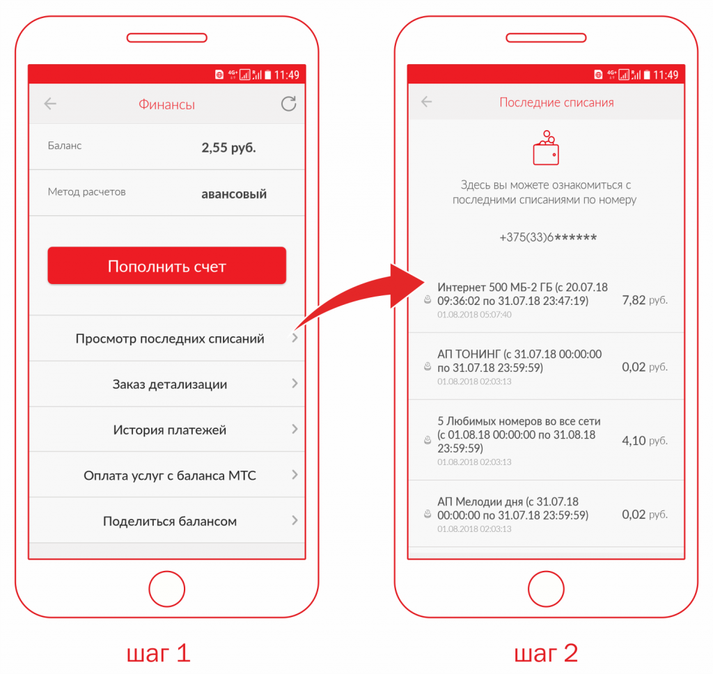 В приложении хранится подробная информация обо всех списаниях со счета за последние 5 суток. Данные можно посмотреть, пройдя по пути «Меню — Финансы — Последние списания».