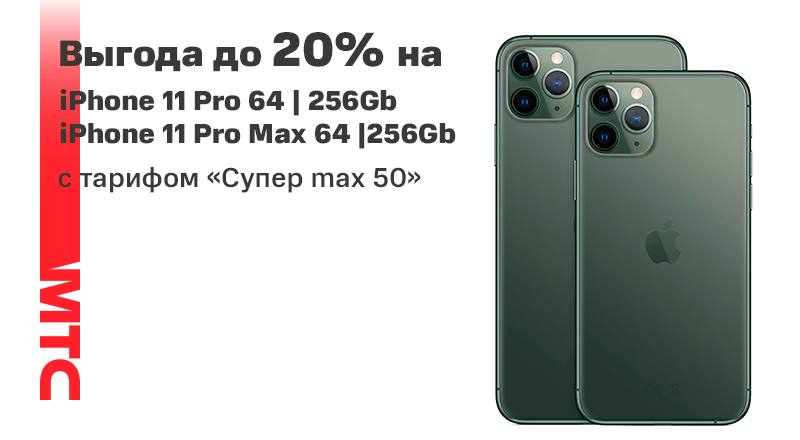 В сети салонов и интернет-магазине МТС к акции «Вам бонус!» присоединяется ряд смартфонов Apple. Теперь с выгодой 20% можно приобрести iPhone 11 Pro и iPhone 11 Pro Max с объёмами памяти на 64 и 256 ГБ.