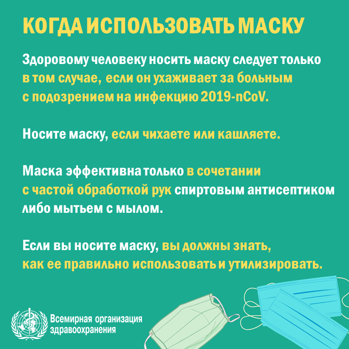 - Тщательно вымыть руки с мылом или обработать спиртосодержащим средством после прикосновения к используемой или использованной маске.