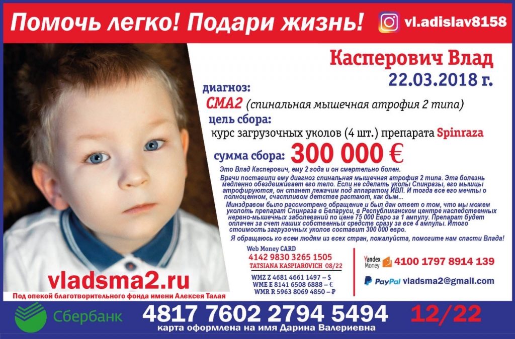 Мама мальчика рассказывает: «У нашего сына Владислава Касперовича, 22.03.2018 г. р., редкое генетическое заболевание — спинальная мышечная атрофия 2 типа. При СМА в организме не вырабатывается белок, который отвечает за работу двигательных нейронов, при этом постепенно слабеют мышцы всего тела. Малыш теряет способность ходить, сидеть, а впоследствии жевать, глотать и даже дышать самостоятельно. Заболевание прогрессирующее и оказывает влияние на все органы. Чувствительность и интеллект у ребенка при этом не нарушаются, у него просто заканчиваются силы жить. Итогом болезни, при отсутствии лечения, будет мучительная смерть от удушья.