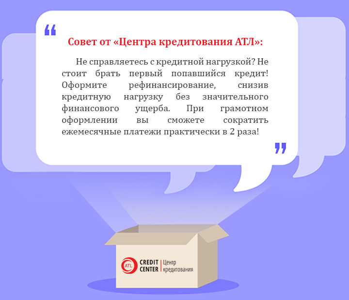 Чтобы не бегать по банкам, можно сразу обратится к кредитному брокеру – в «Центр кредитования АТЛ». В течение получаса менеджер внимательно изучит вашу кредитную историю, источники дохода и другие показатели, чтобы подобрать кредит с максимальной вероятностью одобрения.