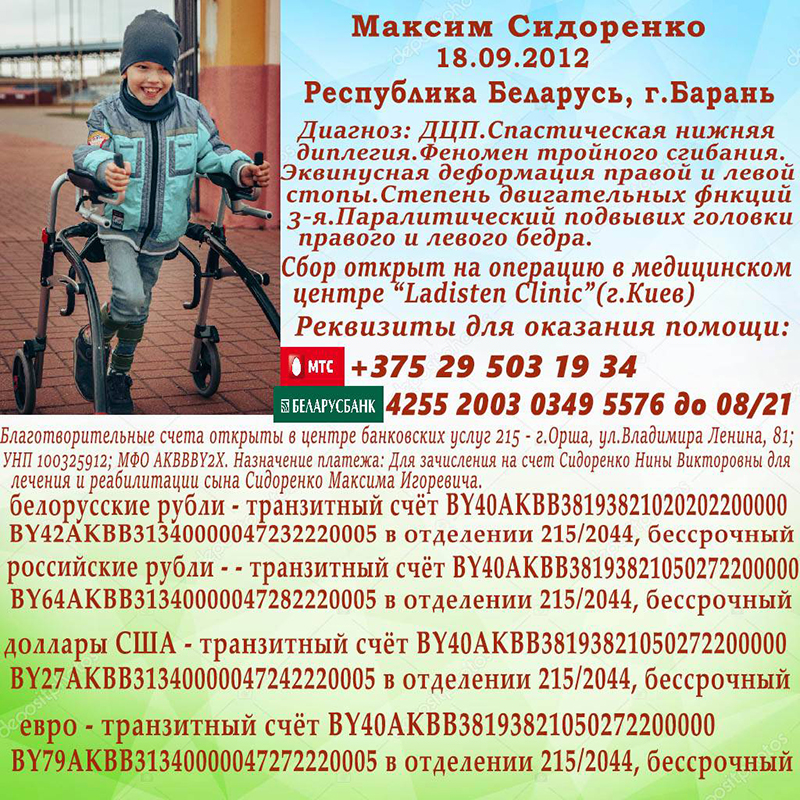 Благотворительные счета открыты в центре банковских услуг 215 — г.Орша, ул.Владимира Ленина, 81; УНП 100325912; МФО AKBBBY2X. Назначение платежа: Для зачисления на счет Сидоренко Нины Викторовны для лечения и реабилитации сына Сидоренко Максима Игоревича.