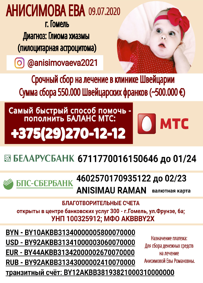 Назначение платежа: Для сбора денежных средств на лечение Анисимовой Евы Романовны.