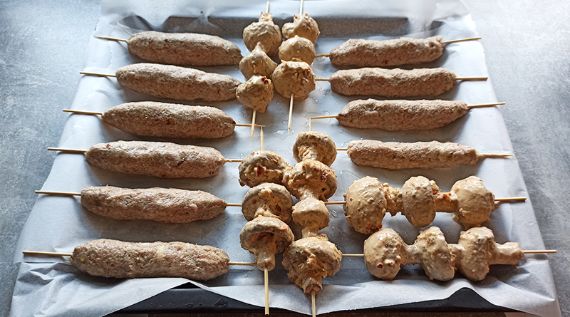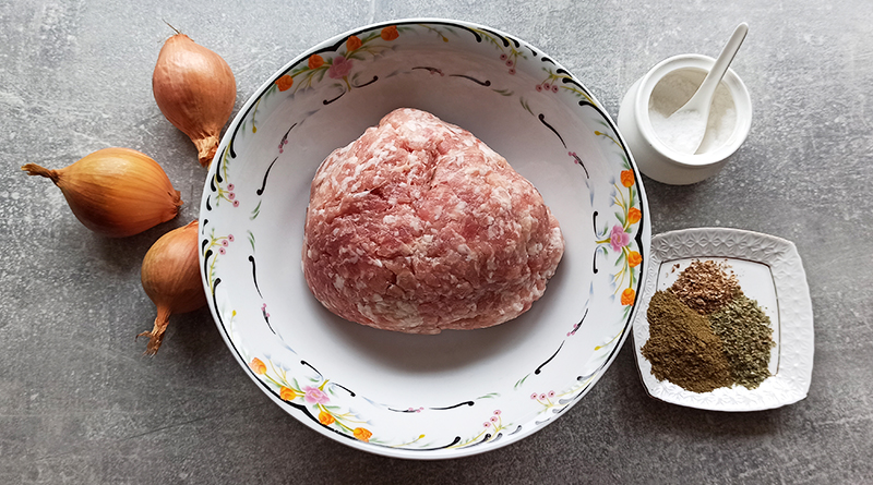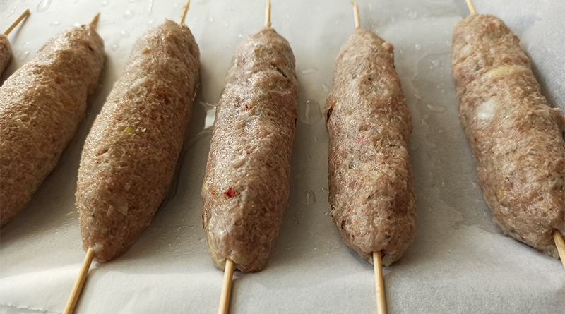Нам понадобится: 1 кг фарша из свинины и говядины (можете взять любой фарш из курицы, свинины, говядины), 150 г сала (несоленое) охлажденного, две луковицы, четыре зубчика чеснока; черный перец, щепотка красного перца, молотый кориандр – 1 чайная ложка, пол чайной ложки зиры, соль по вкусу, растительное масло, деревянные шпажки.