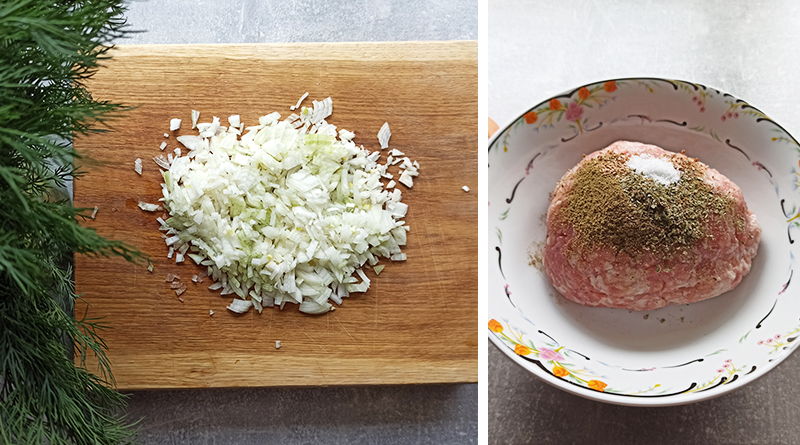 Очищаем лук, чеснок и мелко измельчаем. Сало пропускаем через мясорубку и смешиваем с фаршем. Добавляем лук, приправу, чеснок, соль. Фарш очень тщательно перемешиваем 15-20 минут и хорошо отбиваем, для того чтобы он стал вязким и однородным. Накрываем пищевой пленкой и ставим в холодильник на 1 час.