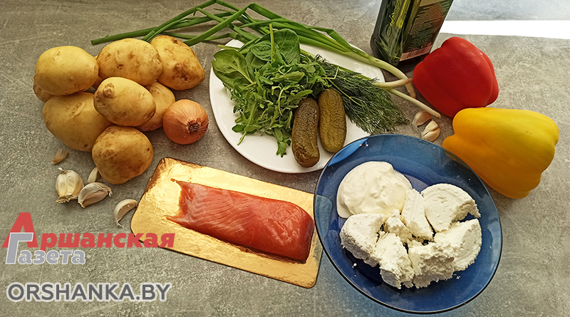 Для творожного соуса: творог – 200 г, сметана – 100 г, зелень (укроп, петрушка), 2 маринованных огурчика, 200 г красной рыбы.