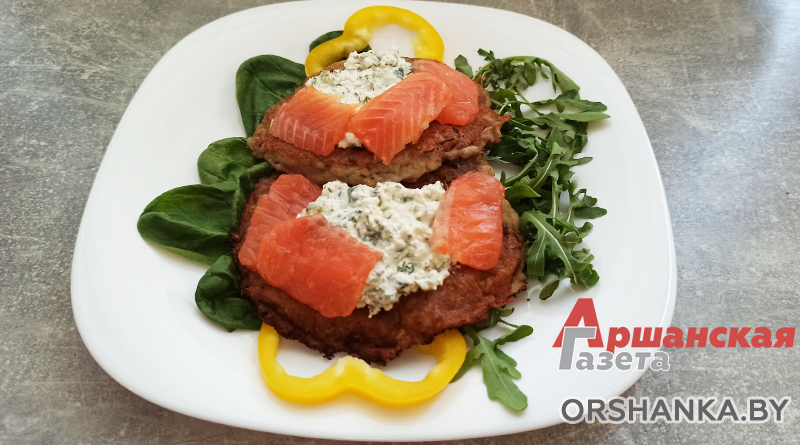 Драники с творожным соусом и красной рыбой