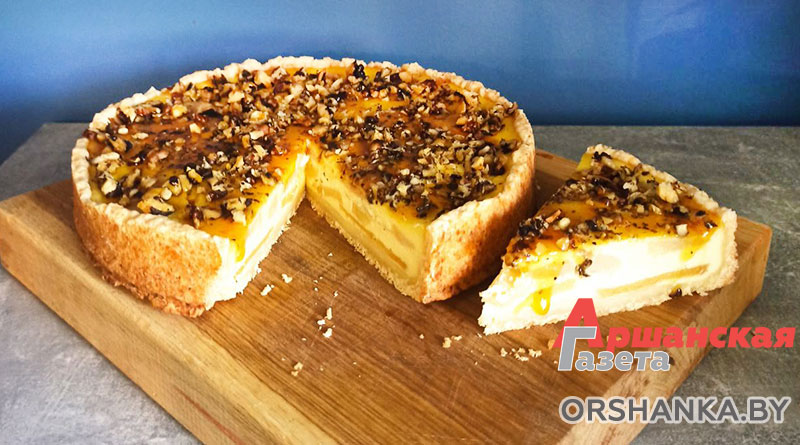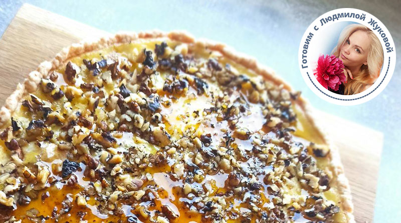 Для заливки: 2 яйца, сметана 26 % жирности, сахар – 100 г, кукурузный крахмал – 30 г, ваниль по вкусу, 50 г измельченных грецких орехов, теплый мед – 2 ст. л., круглая форма для запекания (у меня 28 см).