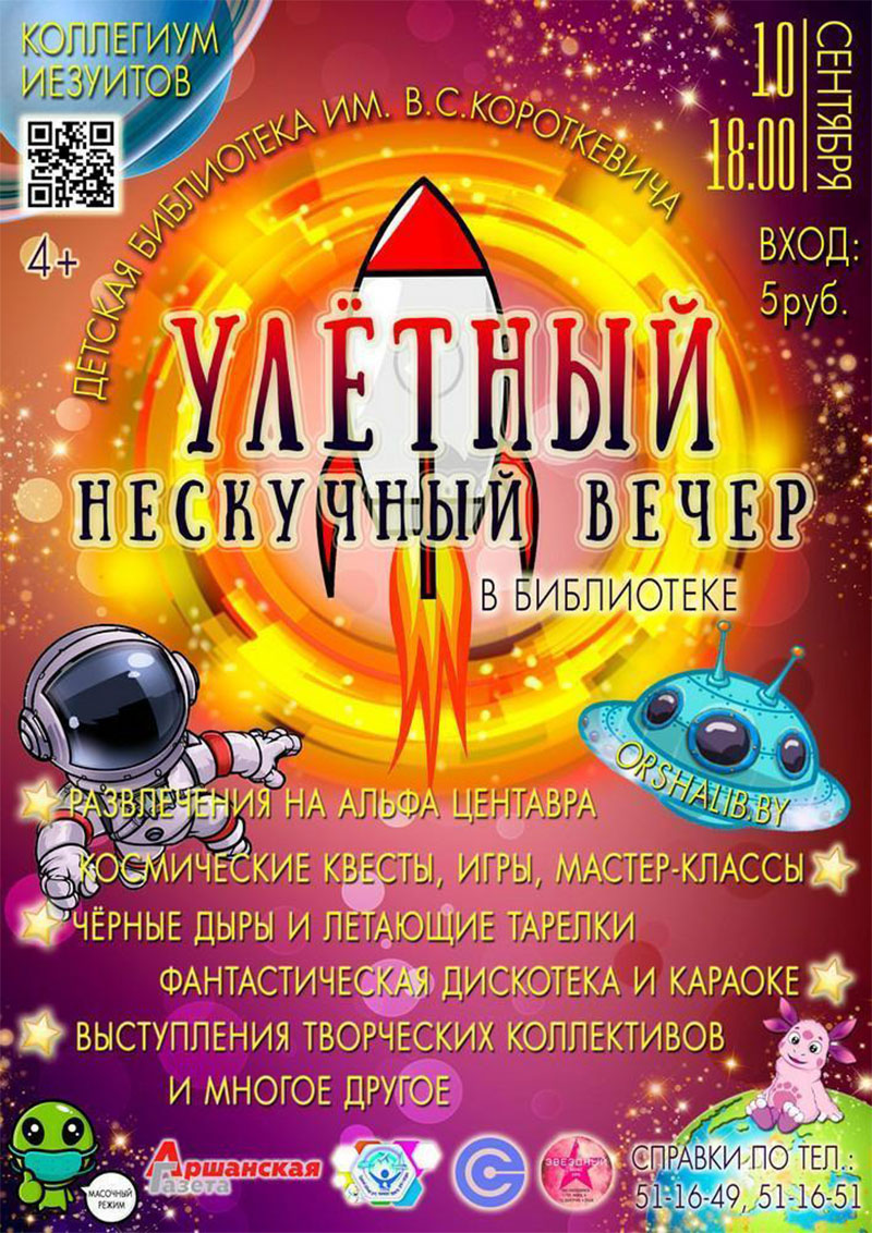 В пятницу 10 сентября детская библиотека им. В. С. Короткевича (коллегиум иезуитов) приглашает в гости. В программе «Улетного нескучного вечера в библиотеке» космические квесты, игры, мастер-классы, дискотека, караоке, выступления творческих коллективов и многое другое. Начало в 18.00.